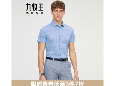 九牧王男装休闲短袖衬衫男2021春夏季新款含桑蚕丝上衣男 JC4022537+浅蓝+修身版